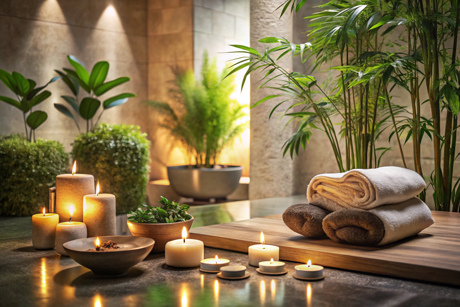 Уютный интерьер спа-салона с мягким освещением, деревянными акцентами и растениями, создающий атмосферу умиротворения